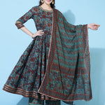 Cotton Calf Length Printed Flared 3/4 Sleeves Round Neck Kurta Bottom Dupatta Set
