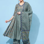 Cotton Calf Length Printed Semi-Flared 3/4 Sleeve V Neck Kurta Bottom Dupatta Set