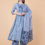 Cotton Calf Length Printed Semi-Flared 3/4 Sleeves Round Neck Kurta Bottom Dupatta Set