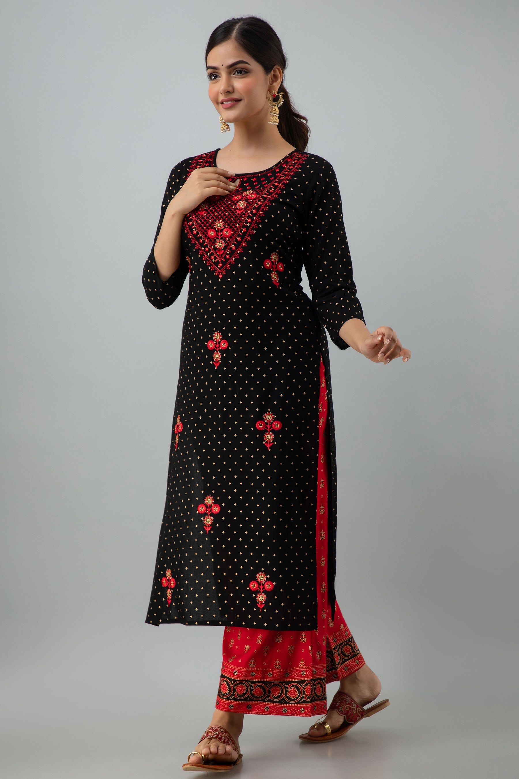 Embroidered Straight Calf Length 3/4 Sleeves Keyhole Neck Rayon Kurta Dupatta Bottom Set