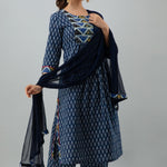 Printed A-line Calf Length 3/4 Sleeves Round Neck Cotton Kurta Dupatta Bottom Set