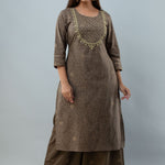 Cotton Calf Length Printed Embroidered Straight 3/4 Sleeves Round Neck Kurta Set