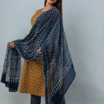Cotton Calf Length Printed Straight 3/4 Sleeves Round Neck Kurta Set