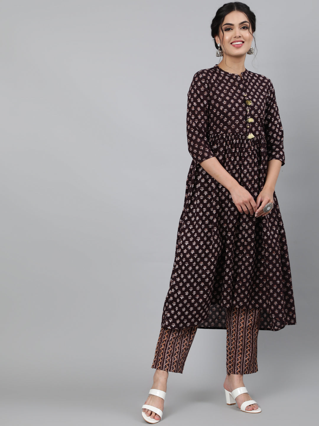Cotton Printed 3/4 Sleeve Flared Collar Neck Calf Length Kurta Set