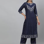 Rayon Printed 3/4 Sleeve A-Line Round Neck Calf Length Kurta Set