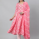 Cotton Embroidered 3/4 Sleeve Flared Round Neck Calf Length Kurta Set