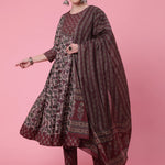 Cotton Calf Length Printed Flared 3/4 Sleeve Round Neck Kurta Bottom Dupatta Set