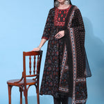Cotton Calf Length Embroidered Straight 3/4 Sleeve Round Neck Kurta Bottom Dupatta Set