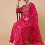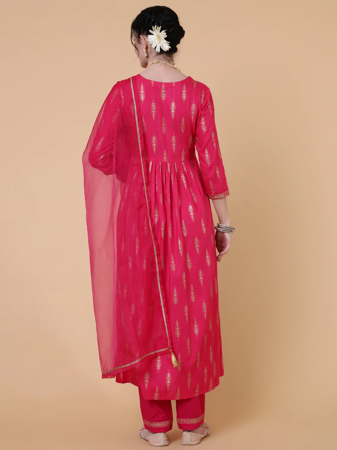 Rayon Calf Length Semi Flared 3/4 Sleeves Printed Round Neck Kurta Bottom Dupatta Set