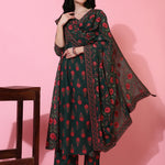 Cotton Calf Length Semi Flared 3/4 Sleeves Printed V-Neck Kurta Bottom Dupatta Set