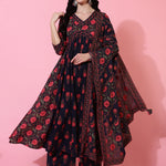 Cotton Calf Length Semi Flared 3/4 Sleeves Printed V-Neck Kurta Bottom Dupatta Set