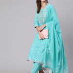 Cotton Calf Length Printed Straight 3/4 Sleeve Round Neck Kurta Bottom Dupatta Set