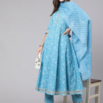 Cotton Calf Length Printed Flared 3/4 Sleeve Round Neck Kurta Bottom Dupatta Set