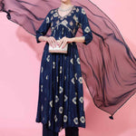 Rayon Calf Length Printed Flared 3/4 Sleeves V-Neck Kurta Bottom Dupatta Set