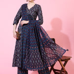 Cotton Calf Length Printed Flared 3/4 Sleeves V-Neck Kurta Bottom Dupatta Set