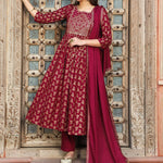 Rayon Calf Length Printed Flared 3/4 Sleeves Round Neck Kurta Bottom Dupatta Set