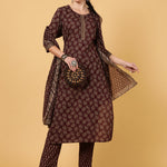 Rayon Calf Length Printed Straight 3/4 Sleeves Round Kurta Bottom Dupatta Set
