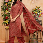 Cotton Calf Length Printed Straight 3/4 Sleeves V-Neck Kurta, Bottom With Dupatta