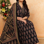 Cotton Calf Length Printed Semi-Flared 3/4 Sleeves V-Neck Kurta, Bottom With Dupatta
