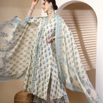 Cotton Calf Length Printed Flared 3/4 Sleeves V Neck Kurta, Bottom With Dupatta