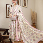 Cotton Calf Length Printed Flared 3/4 Sleeves V Neck Kurta, Bottom With Dupatta