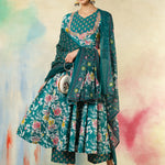 Cotton Calf Length Printed & Embroidered Flared 3/4 Sleeves Sweet Heart Neck Kurta Suit Set With Dupatta