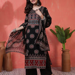 Cotton Calf Length Printed 3/4 Sleeves Round Neck Straight Kurta Suit Set With Dupatta