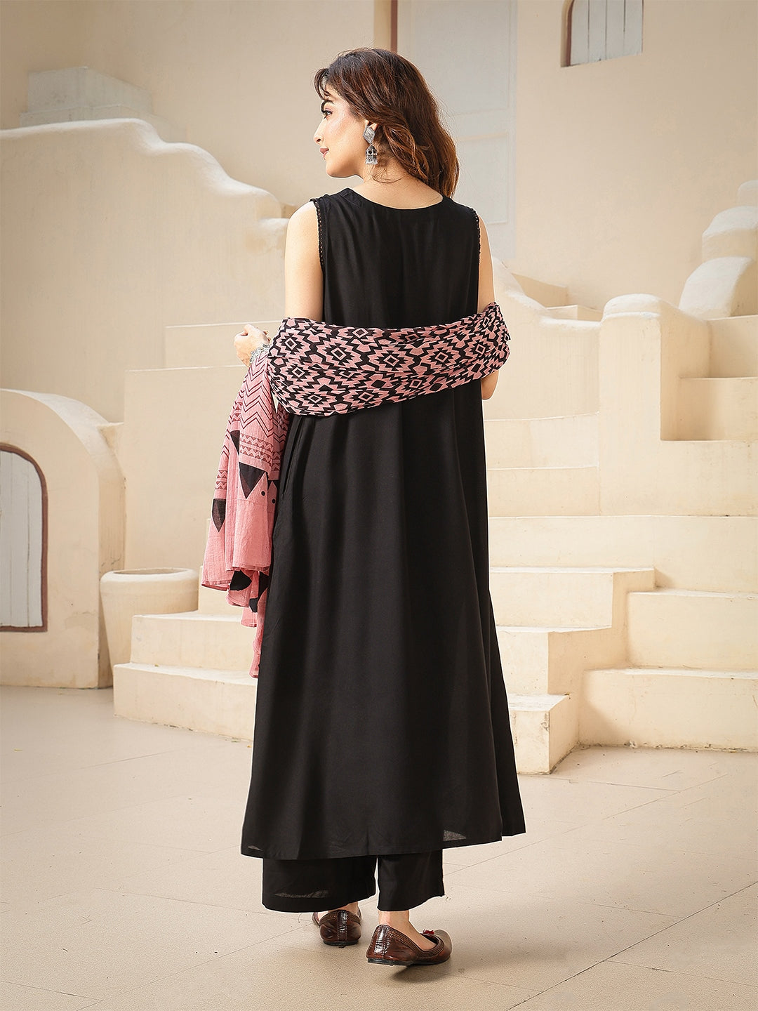 Rayon Calf Length Solid Sleeveless V-Neck A-Line Kurta Suit Set With Dupatta
