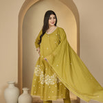 Cotton Calf Length Solid 3/4 Sleeves V-Neck A-Line Kurta Suit Set With Dupatta