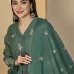 Chanderi Calf Length Solid 3/4 Sleeves V-Neck Flared Kurta Suit Set With Dupatta