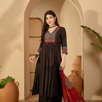 Rayon Calf Length Solid 3/4 Sleeve V-Neck Flared Kurta Suit Set With Dupatta