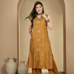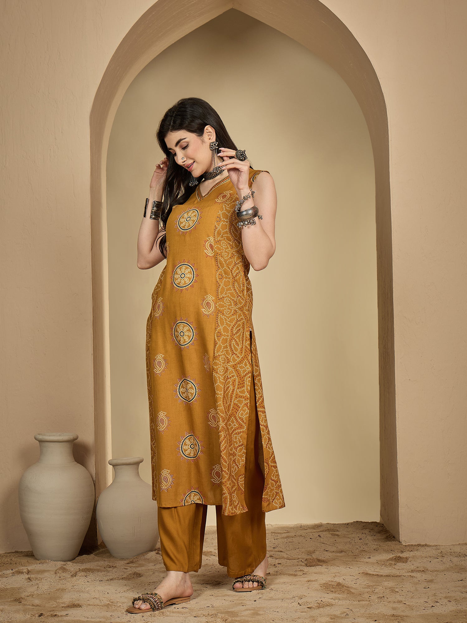 Rayon Calf Length Printed Sleeveless V-Neck A-Line Kurta Suit Set