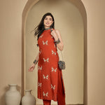 Rayon Calf Length Printed Sleeveless Round Neck A-Line Kurta Suit Set