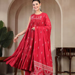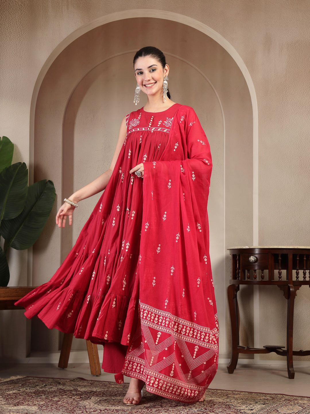 Cotton Calf Length Printed Sleeveless Round Neck Flared Kurta Suit Set With Dupatta