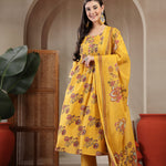 Cotton Calf Length Printed 3/4 Sleeve Round Neck A Line Kurta Suit Set With Dupatta