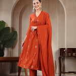 Cotton Calf Length Printed 3/4 Sleeve V Neck Straight Kurta Suit Set With Dupatta