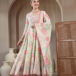 Cotton Calf Length Printed 3/4 Sleeve V Neck Flared Kurta Suit Set With Dupatta