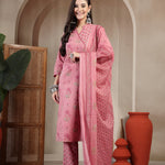 Cotton Calf Length Printed 3/4 Sleeve Mandarin Collar Straight Kurta Suit Set With Dupatta