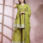 Ethnic Motif Printed Naira Cut Rayon Kurta Palazzo Dupatta Set