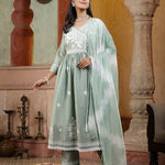 Green Embroidered Cotton Angrakha Cut Flared Kurta Pant Dupatta Set