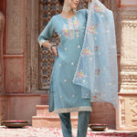 Blue Embroidered Silk Blend Straight Kurta Pant Dupatta Set