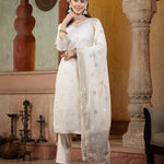 Off White Brocade Work Silk Blend Straight Kurta Pant Dupatta Set