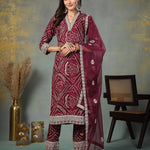 Violet Bandhani Print & Embroidered Muslin Straight Kurta Pant Dupatta Set