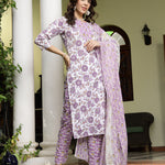 Lavender Floral Printed Cotton Straight Kurta Pant Dupatta Set