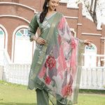 Green Solid & Embroidered Silk Blend Straight Kurta Pant Dupatta Set