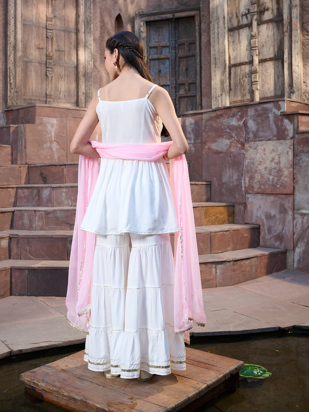 White Solid & Embroidered Rayon Short Kurti Sharara Dupatta Set