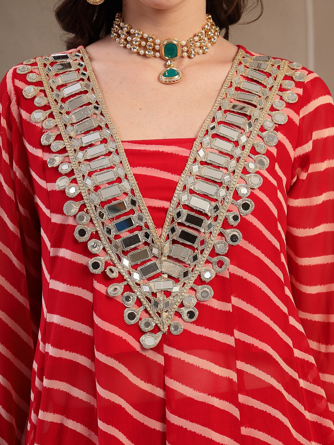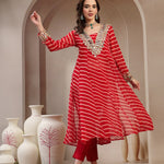 Red Leheriya Printed & Embroidered Georgette A-Line Kurta Pant Set