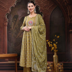 Green Ethnic Printed & Embroidered Cotton Flared Kurta Palazzo Dupatta Set
