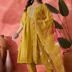 Mustard Solid & Embroidered Silk A-Line Kurta Pant Dupatta Set