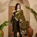 Green Solid Roman Silk Straight Kurta Pant Dupatta Set